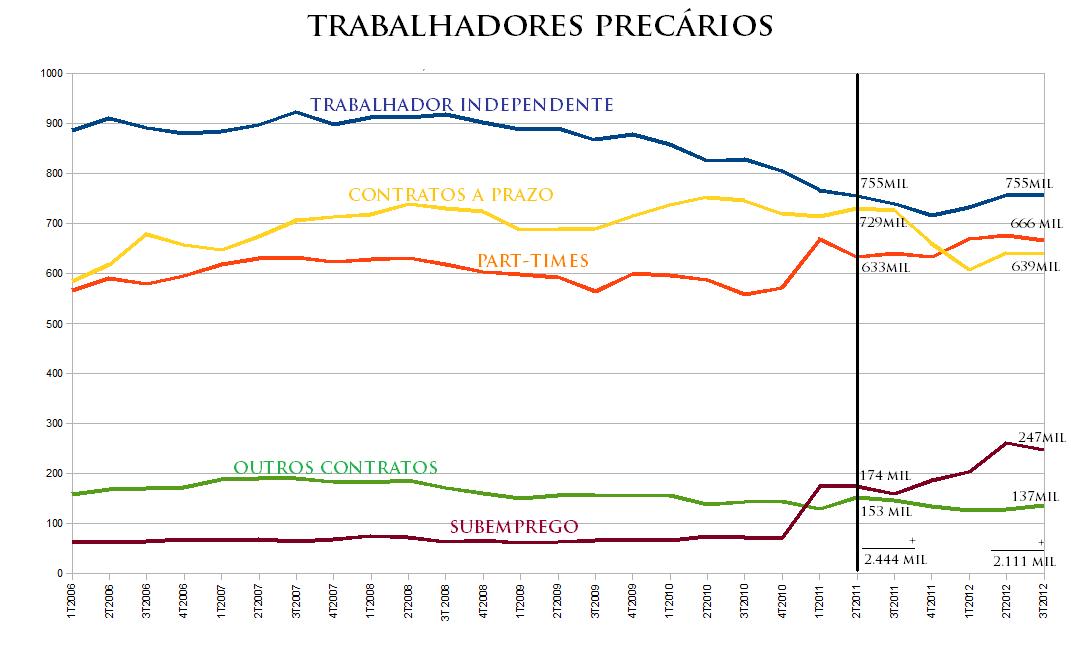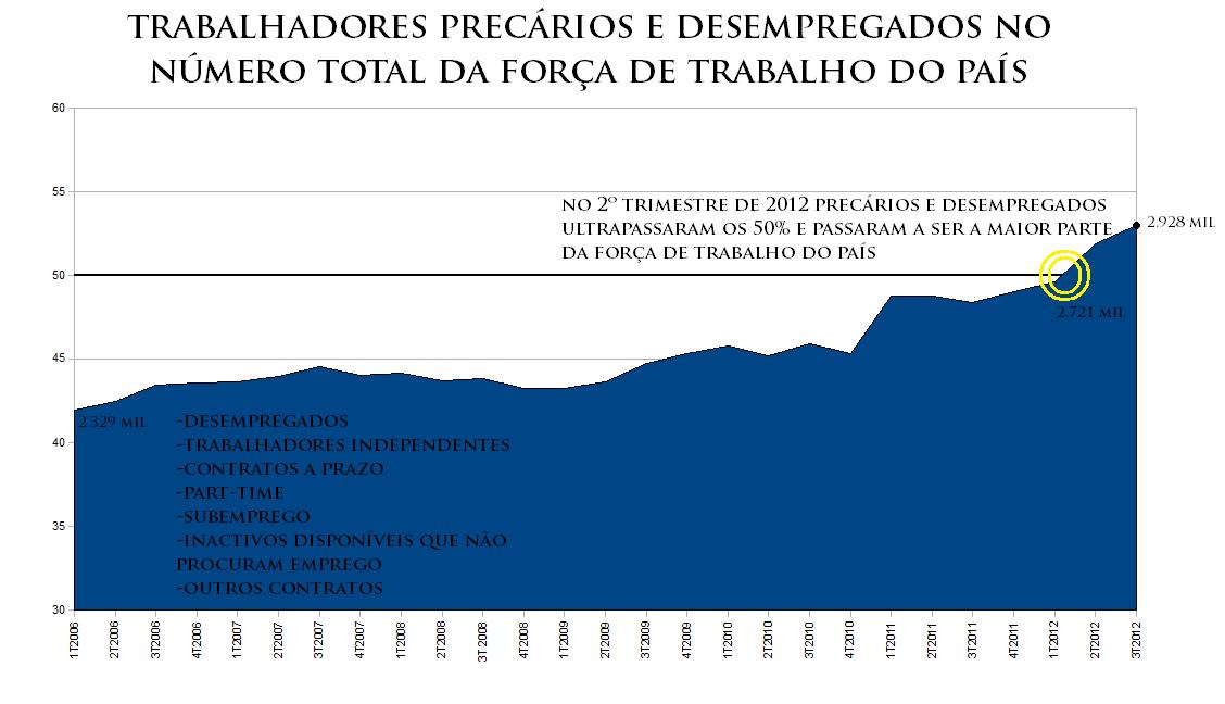 - No 2º trimestre de 2012 o número de trabalhadores precários e desempregados ultrapassou pela primeira vez a metade de toda a força de trabalho em Portugal.